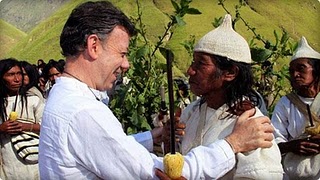 En Zeyemwa, un sitio sagrado para los kogui ubicado en la zona limítrofe de La Guajira con el Magdalena, una representación de indígenas arhuacos, koguis, wiwas y kankuamos, todos habitantes de la Sierra Nevada de Santa Marta, se encargaron de hacerle al próximo presidente Santos un ritual de ascensión al poder.
