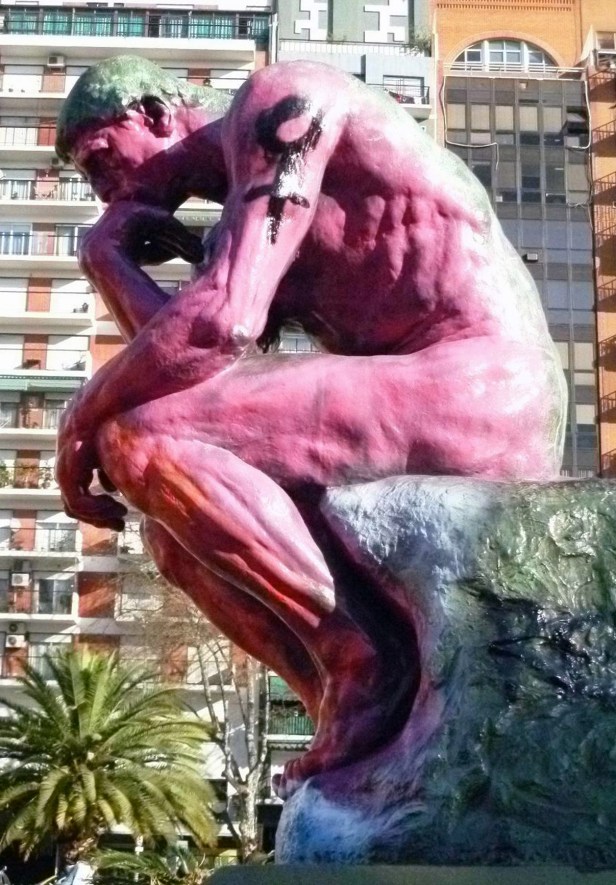 El monumento, una de las obras emblemáticas del padre de la escultura moderna, apareció pintada de rojo por desconocidos que dejaron escrito en el pedestal, con grosera pintura blanca: “De qué te sirvió tanto pensar, antes que se termine”.