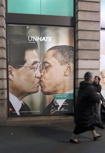 Obama y Hu Jintao. El fotomontaje de la nueva campaña publicitaria de United Colors of Benetton fue presentado este miércoles por Alessandro Benetton, vicepresidente del grupo, en París. Pero incluso antes comenzó a circular por internet y llegó a desplegarse una banderola gigante durante un breve espacio de tiempo cerca del castillo de San Angelo en Roma.