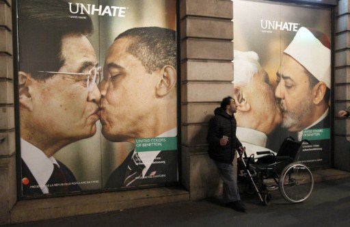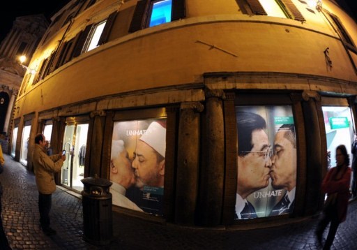 El fotomontaje de Benedicto XVI y el imán de la universidad egipcia de El Cairo, Ahmed el Tayeb, dándose un pasionado beso era el más controvertido de los seis incluidos en la campaña publicitaria ‘UNHATE’ (‘Contra el odio’), en la que aparecen jefes de Estado o de gobierno en la misma posición cariñosa.