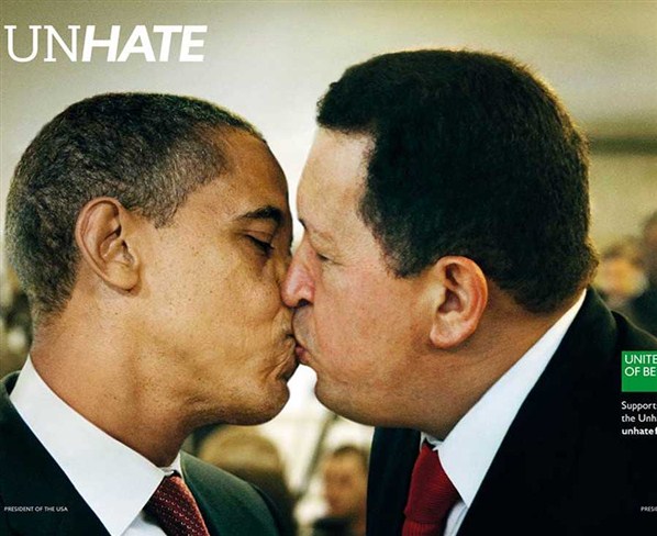 Obama besa a Chávez.Benetton mantiene sin embargo las otras fotografías con las que empapelará los comercios del grupo en todo el mundo. En una de ellas, el presidente venezolano, Hugo Chávez, y su homólogo estadounidense, Barack Obama, vestidos con corbata, se besan en la boca.