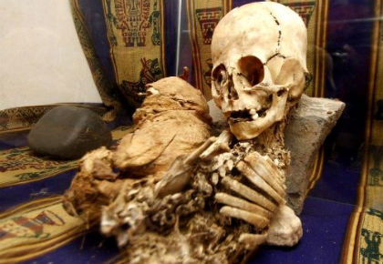 Uno de los esqueletos tiene 50 centímetros de estatura, cabeza triangular, grandes cavidades en los ojos y molares que no son comunes en los seres humanos, según un dijo el director de un museo del país inca.