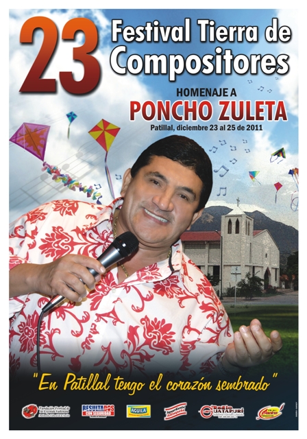 JUAN RINCÓN VANEGAS.- Los directivos del 23 Festival Tierra de Compositores de Patillal, a celebrarse del 23 al 25 de diciembre de 2011, continúan dándole el mayor despliegue al evento que cierra el calendario folclórico en Colombia, y pusieron a circular el afiche donde aparece la figura del cantante Tomás Alfonso ‘Poncho’ Zuleta Díaz, quien será el gran homenajeado.