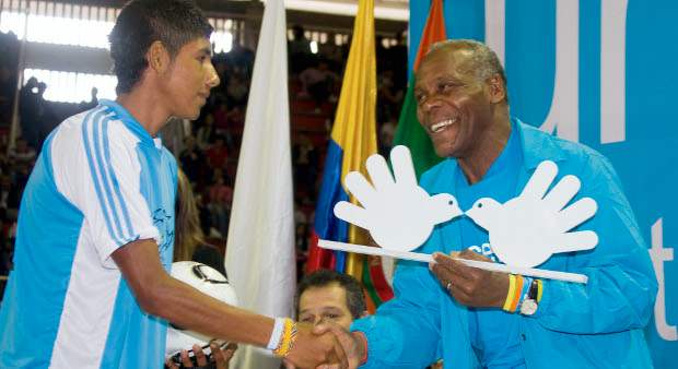 El actor estadounidense y embajador de buena voluntad de Unicef, Danny Glover, fue el encargado de mover el balón para el inicio del primer Torneo Nacional de Golombiao Juego contra la violencia.