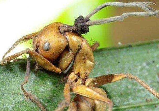 Hormigas zombies En Brasil, investigadores de la Universidad de Pensilvania, Estados Unidos, descubrieron cuatro especies de hongos del género ‘Ophiocordyceps’ que infectan a las hormigas y manipulan su comportamiento para obligarlas a dispersar sus esporas en sitios determinados y poder reproducirse. Las hormigas pierden el control y la voluntad .