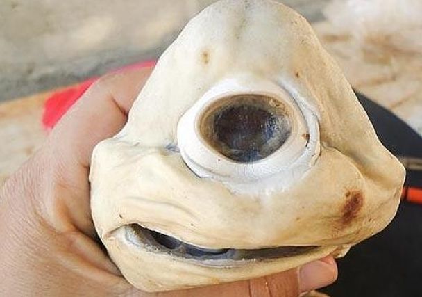 Pez cíclope Este feto de tiburón padece una condición congénita llamada ciclopía, que se produce en varias especies animales. Fue descubierto en las entrañas de su madre, capturada en el golfo de California. Mide 56 centímetros de largo .