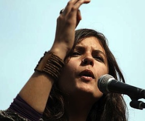 Intervención de la líder estudiantil chilenaCamila Vallejo en el lanzamiento de su libro Podemos cambiar el mundo durante la Fiesta de los Abrazos 2012