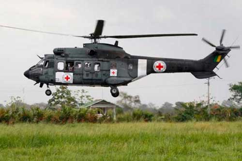 Los helicópteros Súper Cougar de la Fuerza Aérea de Brasil, con los emblemas de la Cruz Roja Internacional, quedaron en el aeropuerto Vanguardia de Villaviencio, a unos 75 kilómetros al sureste de Bogotá, desde donde partirán hoy a primera hora hacia algún lugar de las selvas colombianas.
