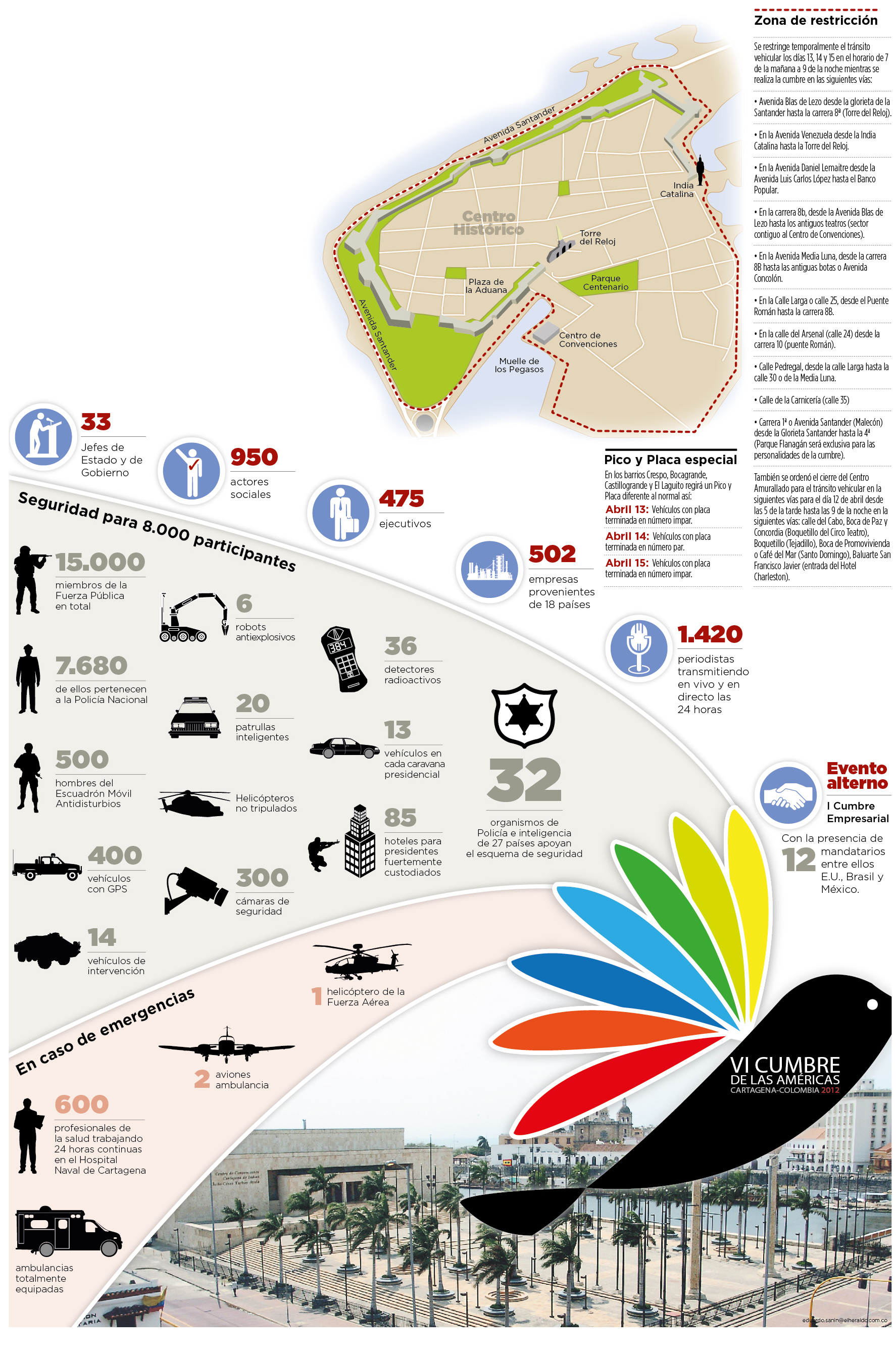 Un dispositivo de seguridad sin precedentes en la historia del país se desplegó en Cartagena para garantizar la VI Cumbre de las Américas, la cita de cada tres años, donde se debaten los problemas y desafíos que enfrenta el continente americano. El despliegue de tecnología para la protección de los jefes de Estado y la logística puesta en marcha, ponen a prueba qué tan entrenado está el país para este gran evento. Así será el dispositivo de seguridad para la Cumbre.