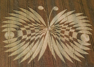 Esta mariposa , símbolo de transformación en muchas culturas, hizo parte de la temporada de ‘crop circles’ de 2007. Al lado, si se corta esta espiral escalonada en diez pedazos como una pizza y luego se cuenta cuántas porciones recorre cada trecho, se observa que en realidad es un código para el número pi.