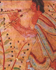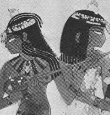 La mayor parte de los instrumentos egipcios fueron adoptados por los griegos quienes, sin embargo, quisieron disimular su procedencia atribuyendo a los dioses helénicos su invención. Asi Hermes sería el inventor de la lira; Apolo de la citara, Pan de la flauta policálama (flauta de Pan) y Palas Athenea del aulos (caramillo). En general, los griegos prefirieron los instrumentos de cuerda a los de viento. Entre estos últimos, los más difundidos fueron la flauta recta y el aulos simple o doble, instrumento de lengüeta del que existían dos versiones que pueden considerarse como los más antiguos antepasados del oboe y del clarinete.