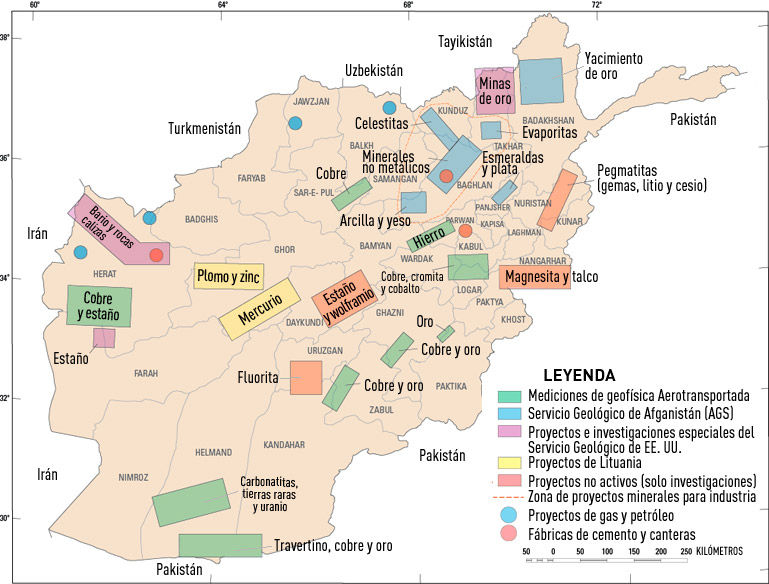 Se calcula que Afganistán tiene riquezas minerales por valor actualmente de unos 3 billones (trillion en inglés) de dólares. Los estudios realizados por el Departamento de Defensa de EE. UU. tan solo en la provincia de Ghazni al suroeste de la capital afgana de Kabul indican que Afganistán podría tener yacimientos del mineral de litio tan grandes como los de Bolivia, país con los mayores depósitos de litio que se conocen del planeta. Por ello un documento interno del Pentágono llegó a estimar que Afganistán podría convertirse en la “Arabia Saudita del litio” en referencia al país árabe poseedor de las mayores reservas probadas de petróleo del mundo. El litio es un metal y mineral estratégico utilizado en la fabricación de baterías para teléfonos celulares y computadoras portátiles, en la manufactura de sistemas ópticos, en aleaciones de gran resistencia utilizadas en la construcción de aviones, en los combustibles de cohetes, en sistemas de aire en submarinos, como combustible de torpedos antisubmarinos y al parecer también en armas nucleares.