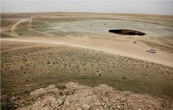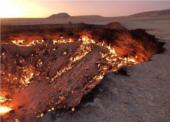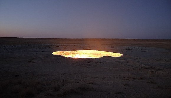 En el desierto de Karakum (Turkmenistán) se encuentra este enorme agujero de 70 metros de ancho que empezó a arder en 1971 y continua haciéndolo hoy en día. Es conocida como la puerta del infierno y las llamas son visibles a kilómetros de distancia por la noche.