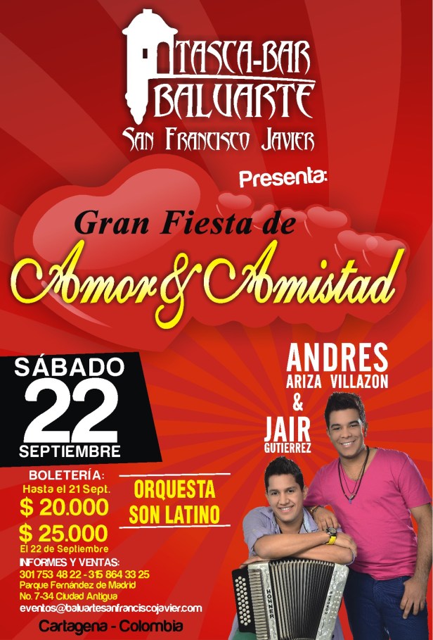 Andrés Ariza Villazón, el artista revelación del vallenato, animará este 22 de septiembre la gran fiesta de Amor y Amistad que se celebrará en Taska Bar, Baluarte San Francisco Javier, centro histórico de Cartagena, donde ofrecerá lo mejor de su repertorio musical contenido en el álbum ‘El Ganador’.