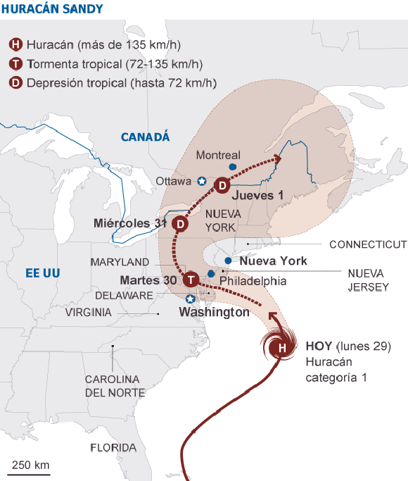 La zona más peligrosa de la costa Este en las próximas horas, es la comprendida entre Nueva Jersey y Connecticut, según han explicado los meteorólogos. El paso del huracán tiene en jaque a cerca de 60 millones de personas y a 23 Estados de los 50 que conforman la nación. Cerca de tres millones de personas están sin luz en las zonas más afectadas.”Es una tormenta muy seria y puede tener consecuencias fatales. Me preocupa que la gente esté segura”, ha dicho Obama, este lunes en rueda de prensa. La costa Este se prepara para una larga semana. El mandatario ha puntualizado que “incluso una vez que pase la tormenta tardará días en recuperarse la marcha normal de las ciudades. Desde el transporte público a los cortes de luz”, ha añadido el mandatario. Los efectos de la fuerte tormenta no se han hecho esperar en los más de 10 Estados -entre los que se encuentran Nueva York, Maryland, Pensilvania, Virginia, Connecticut, Nueva Jersey, Massachussets y Delaware, y el Distrito de Columbia- que han declarado el estado de emergencia.