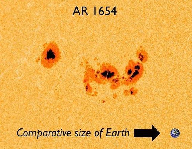 La imagen sobre estas líneas, obtenida por el Observatorio de Dinámica Solar (SDO) de la NASA, muestra la estructura de la mancha, que se extiende a lo largo de decenas de miles de km. sobre la superficie del Sol. En la esquina inferior derecha, una imagen de la Tierra da idea de las dimensiones de AR1654.