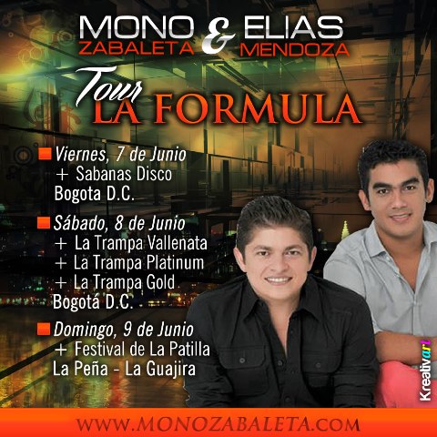 De que están pegao’s en el interior del país…están pegao’s…y eso lo confirma el retorno a Bogotá D.C., de La Fórmula: el MONO ZABALETA & ELÍAS MENDOZA, donde animarán cuatro conciertos entre hoy viernes y mañana sábado en las discotecas Sabana en Vivo, La Trampa Vallenata, La Trampa Platinum y La Trampa Gold.