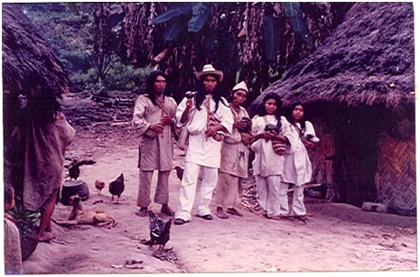 Indigenas: Koguis y Wiwas frente a su cansamaría o casa mayor, lugar para diferentes tipos de reuniones rituales. Aquí un grupo con sus instrumentos musicales:el primer indígena interpreta el carrizo hembra, el segundo la maraca y el carrizo macho y los tres últimos cada uno con la concha morrocoy.