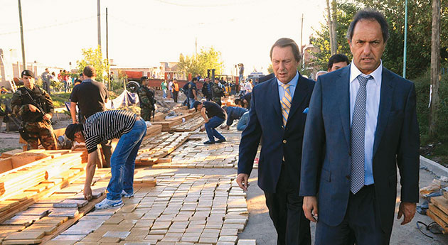 Los decomisos de drogas se han vuelto pan de cada día en el país austral. En la foto, el gobernador de la provincia de Buenos Aires, Daniel Scioli, y el entonces ministro de Justicia y Seguridad. Ricardo Casal, inspeccionan un alijo encontrado en Ingeniero Budge. Foto: A.F.P.