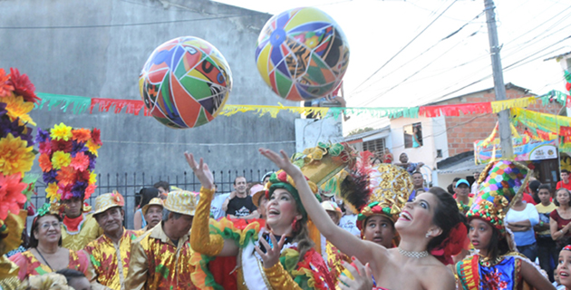 En la izada de bandera del Congo Barranquillero toda la cuadra salió a recibir a la reina, que bailó con los congos en un trencito carnavalero. Como en todas las paradas, pasó la bola –literalmente– entre los asistentes.