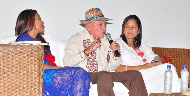 El escritor venezolano Nemesio Montiel junto a las colombianas Delia Bolaños (izq.) y Lindaantonella Solano, los tres pertenecientes a la etnia wayuu’