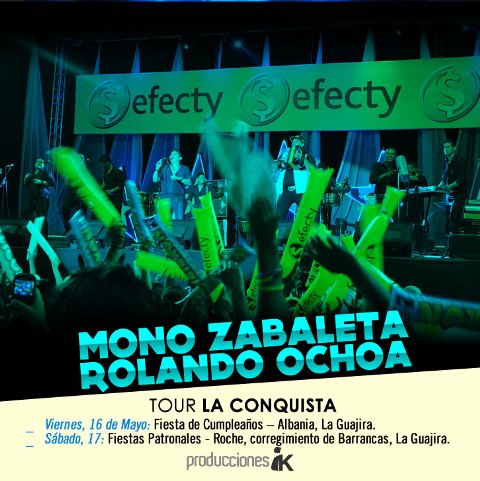 TOUR LA CONQUISTA Viernes, 16 de Mayo: Fiesta de Cumpleaños – Albania, La Guajira. Sábado, 17: Fiestas Patronales – Roche, corregimiento de Barrancas, La Guajira. REDES SOCIALES Twitter e Instagram: @MonoZabaleta – @Rolando_8A Facebook: MONO Zabaleta Youtube: MonoZabaletaTV CONTACTO DIRECTO FABIO QUIROZ – MANAGER GENERAL Celulares: 300 3114491 – 311 6976963 Email: fabio0736@hotmail.com Twitter: @FABIOQUIROZ Follow @portalvallenato