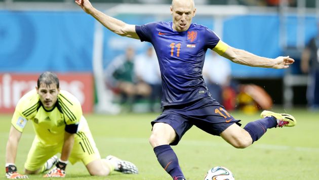 En el inicio del partido, cuando los equipos aún se estaban acomodando, Robben demostró nuevamente que es un segundo más rápido que el resto y aprovechó una habilitación de Van Persie para irse derecho al arco y si bien Thiago Silva lo tomó de la camiseta, lo cierto es que fue afuera del área pero él se dejó caer adentro.