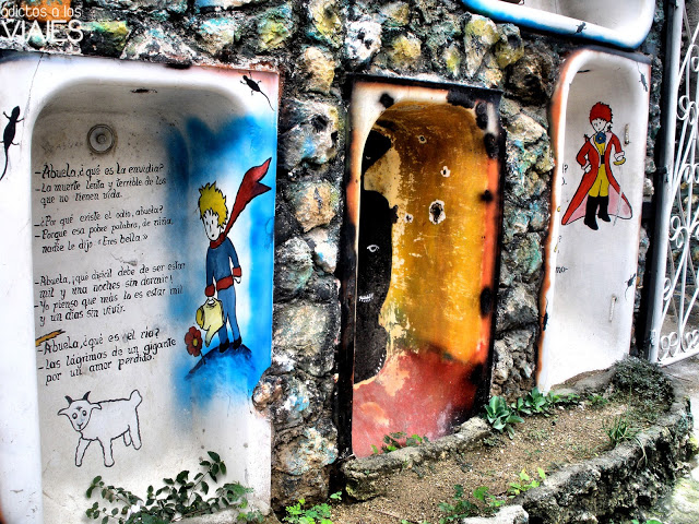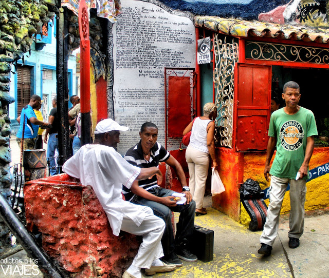 Una vez pasas esa puerta, empiezas a ver muros de colores mires por donde mires, poemas, esculturas realizadas por objetos de todo tipo: bicicletas, bañeras, maniquíes… Incluso hay una representación escultórica de un santuario de la religión africana Palo Monte. Religión, santería, escultura, pintura, música, poesía… concentradas en apenas 200 metros metros de una pequeña callejuela del centro de La Habana, una calle que es el epicentro de la cultura afrocubana de la ciudad.