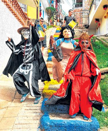 Jeison, el muchacho que se negó a lucir el disfraz de una dama improvisada, prefiere enfundarse en un enterizo negro, de huesos pintados a mano con témpera blanca que simulan un esqueleto. Es un disfraz al que le llaman La Muerte. A su lado, Camilo se viste de un diablo con capa larga y máscara de facciones tenebrosas y cachos afilados. Otro chico interpretará a un viejito que, pese a sus años, dará siempre la impresión de andar con el manual de la juventud debajo del brazo. Carlos se decidió por La Culona, mientras