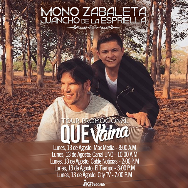 Durante la presente semana, el Mono Zabaleta & Juancho de La Espriella; se encuentran de promoción en Bogotá cubriendo prensa, radio y televisión, presentando la canción Que Vaina, cuyo videoclip fue estrenado el día sábado y puede ser visto en diferentes redes sociales y en YouTube. Vale resaltar cómo esta canción con poco más de un mes de haber sido lanzada, ya se encuentra en los primeros lugares en las diferentes emisoras del país.