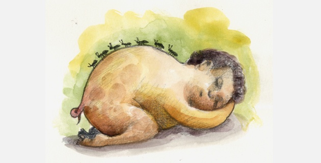 La agonía de su madre desangrándose tras el mal parto distrajo a todos del destino del niño. Cuando su padre recordó, lo que alcanzó a ver fueron los pedazos pelados de pellejo que las hormigas coloradas, tropezando con una y otra piedra, conducían a su guarida, mientras el furioso viento bíblico que habría de barrer a Macondo de la faz de la tierra intensificaba sus estertores apocalípticos.