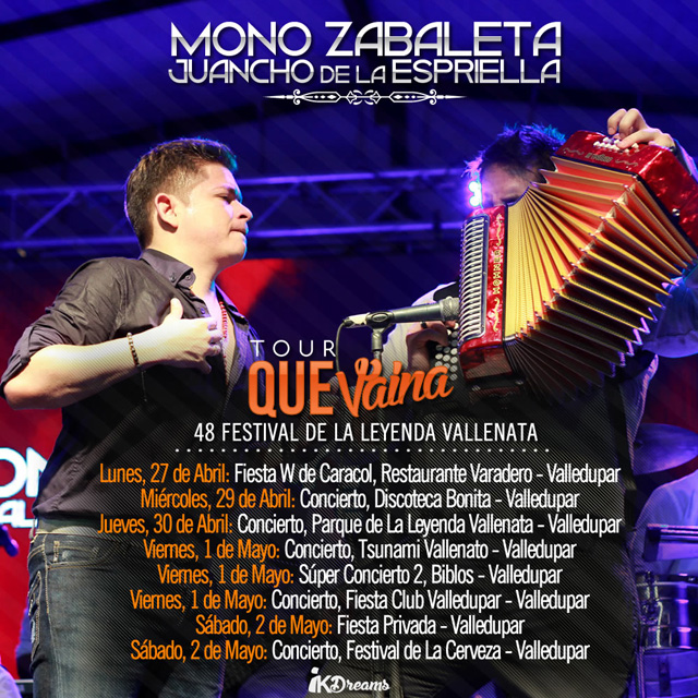 Esta maratón en la ciudad de Valledupar, comenzará desde el lunes 27 de Abril con un evento para Caracol Radio en Varadero y continuará el miércoles en la Discoteca Bonita. El jueves se llevará a cabo la presentación en el Parque de la Leyenda Vallenata y el viernes serán tres conciertos para celebrar el Día Internacional del Trabajo: el Tsunami Vallenato, El Súper concierto 2 y la Fiesta del Club Valledupar, para finalizar el sábado un evento privado y el Festival de la Cerveza.