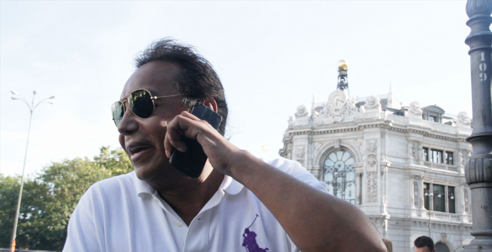 Una comunicación por celular con el imponente Banco de la República de Madrid, a sus espaldas.Foto: Javier Klever