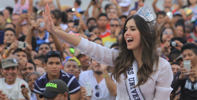 Paulina Vega Dieppa, Miss Universo, en medio de la multitud que le tomaba fotos con celulares y cámaras profesionales en la Plaza de la Paz.