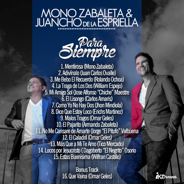 Solo restan tres días para disfrutar PARA SIEMPRE. Y para ayudarnos en esta espera el Mono Zabaleta & Juancho de La Espriella nos han regalado dos adelantos de lo que será esta producción. Los resultados no pueden ser mejores. El público en general y expertos han catalogado estos dos temas como un paliativo dentro de lo que se ha venido grabando recientemente.
