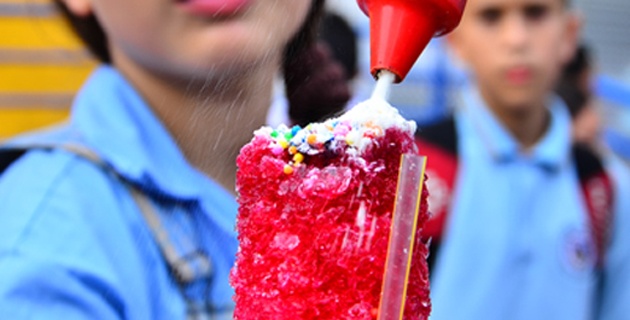En la puerta de cada colegio se observa un carrito con envases de vidrio o botellas plásticas con esencias de frutas o artificiales, alrededor de una máquina artesanal para raspar o moler cubos de hielo, que serán el relleno de un vaso plástico adornado con diferentes elementos, y que se consume con un pitillo.