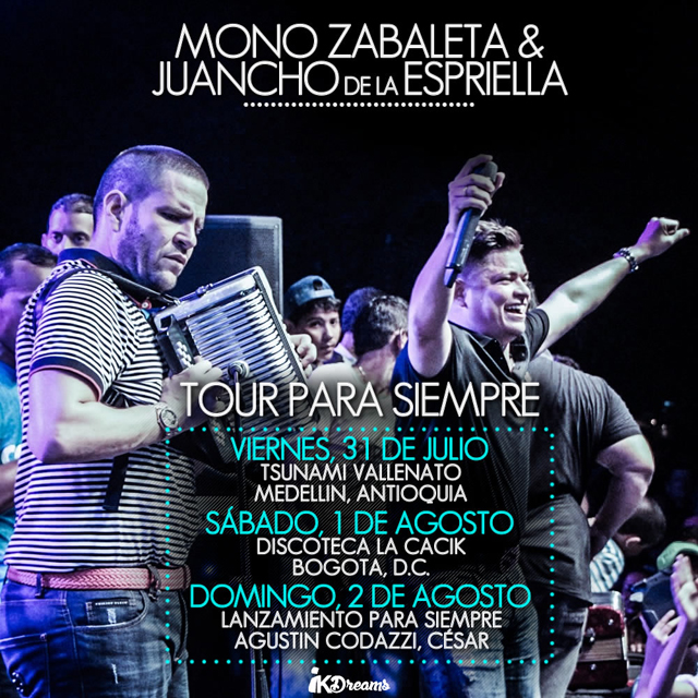 Se viene otro fin de semana de grandes retos para el Mono Zabaleta & Juancho De la Espriella. Tres días, tres departamentos, y como PARA SIEMPRE tiene ya impacto nacional, estaremos visitando nuevamente el interior del país, sin olvidar nuestra costa mi Caribe.