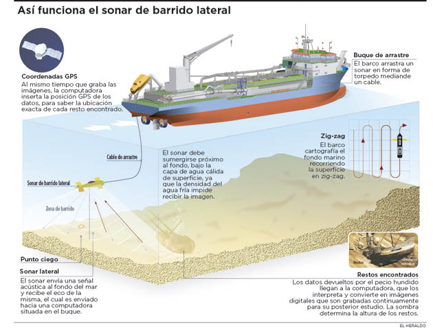 El equipo emite ondas sonoras que rebotan con información transmitida desde el torpedo, llamado ‘Pez’, hasta unos computadores. El dispositivo también registra coordenadas por geolocalización satelital.