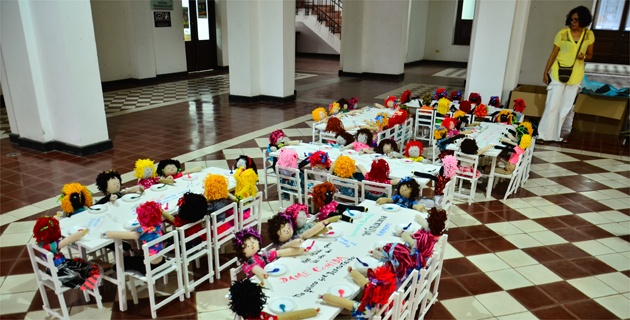 Muñecas de trapo sentadas en pequeñas sillas de madera, ubicadas alrededor de tres mesas de comedor, donde cada una tiene enfrente un plato vacío, conforman una escena crítica plasmada en la instalación de la artista Gladys Molina, de Juan de Acosta, quien denuncia la problemática de desnutrición infantil en su territorio.
