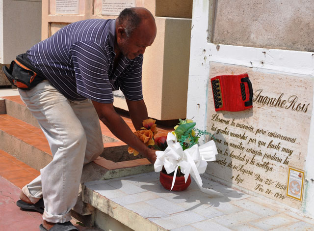 Con toda la paciencia del mundo lava y limpia la lápida. Se le pasa gran parte del tiempo rezando, y escuchando desde su celular el sonido del acordeón de su adorado artista. Siempre explica que para él, Juan Humberto Rois Zuñiga es el acordeonero más grande del mundo.