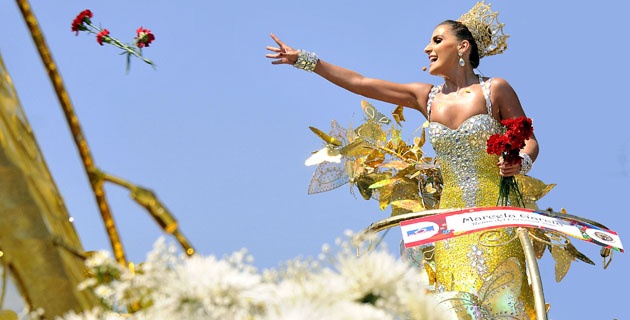 La reina del Carnaval, Marcela Caballero, lanzando flores a los espectadores.