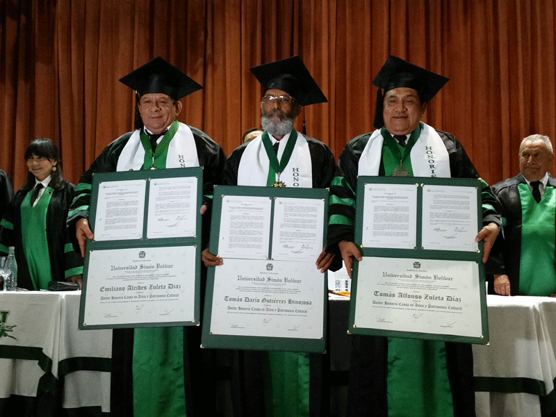 Hace unas horas en el Teatro José Consuegra Higgins de la Universidad Simón Bolívar de la ciudad de Barranquilla, Emiliano Alcides y Tomás Alfonso Zuleta Díaz, al igual que el abogado Tomás Darío Gutiérrez, recibieron el título Doctorado en Arte y Patrimonio Cultural, en Honoris Causa.