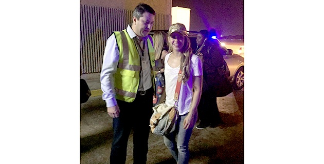 La cantante llegó a bordo de un jet blanco con bandera española. Tres camionetas blindadas de color plata la recogieron en la pista del Cortissoz. El director del aeropuerto, Álvaro González, fue el encargado de darle la bienvenida a la ciudad.