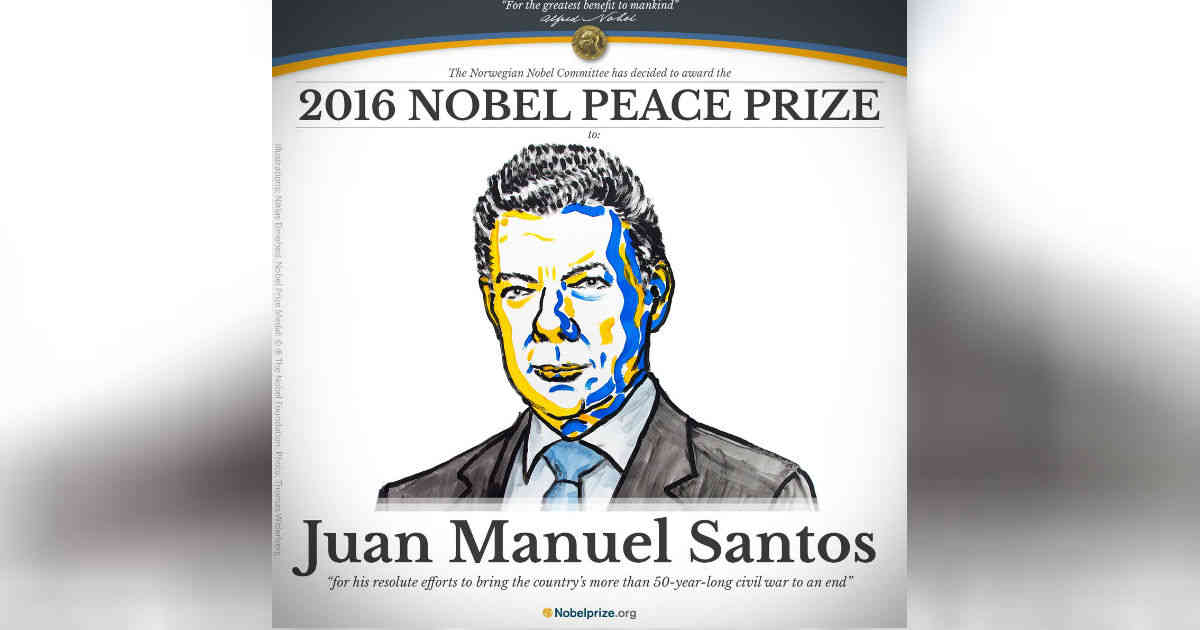 «El premio Nobel de Paz para 2016 para el presidente colombiano, Juan Manuel Santos, por sus esfuerzos para terminar la guerra de más de 50 años del país y que ha cobrado la vida de más de 220 mil colombianos, así como desplazado a cerca de 6 millones de personas», indicó la presidenta del Comité Nobel de Noruega, Kaci Kullmann Five, esta mañana en el anuncio.