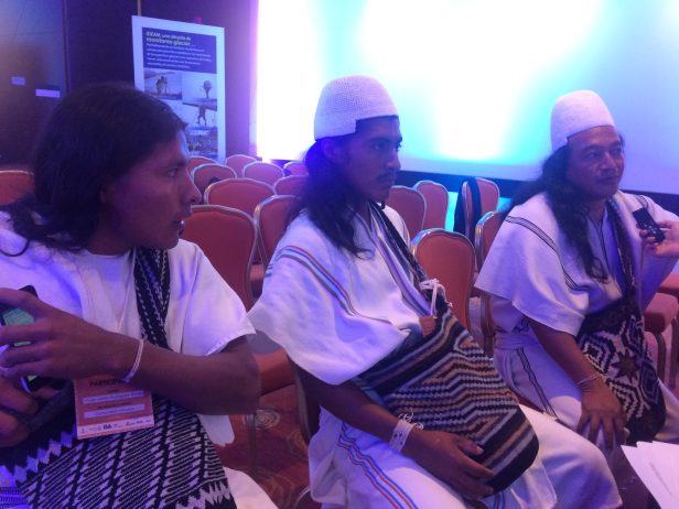 Los Arhuacos que llegaron al evento ambiental en un hotel al norte de Bogotá con su vestimenta típica, mantas blancas, sombrero del mismo color y una mochila, contrastaron con los otros asistentes, quienes vestían saco, corbata y vestido de gala.