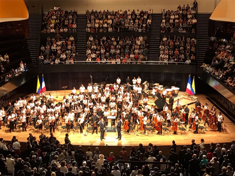 El Concierto de la Orquesta Binacional, que se llevó a cabo en un escenario dispuesto para 2.400 personas, ubicado en la ‘Ciudad de la Música de París’, se inició con la interpretación de los himnos nacionales de Colombia y Francia e incluyó música tradicional de ambos países, en una integración de instrumentos que incluyó marimbas, acordeones y arpas francesas y colombianas.