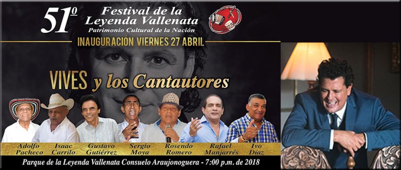 El 27 de abril a partir de las 7:00 de la noche en el Parque de la Leyenda Vallenata ‘Consuelo Araujonoguera’ se llevará a cabo la inauguración del 51° Festival de la Leyenda Vallenata en homenaje al artista Carlos Vives, con una variada programación que incluye un acto teatral, cinematográfico y musical, presentaciones artísticas y de cantautores vallenatos.