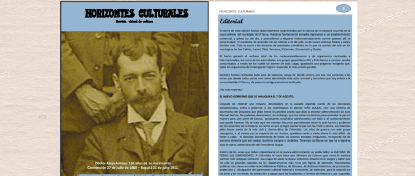La Revista “Horizontes Culturales” (Edición virtual – digital), con sede en Ocaña (Norte de Santander), bajo la dirección de Don Luís Eduardo Páez García, actual Presidente de la Academia de Historia de Ocaña, me hace llegar este órgano informativo del Arte, la Cultura, la Historia, el Arte, el Folclor y muchas cosas más.