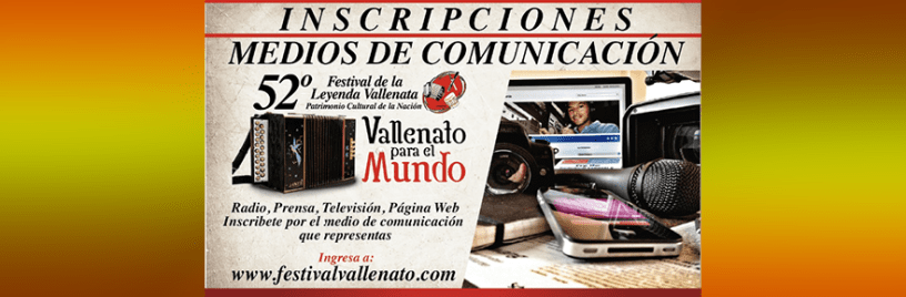La Fundación Festival de la Leyenda Vallenata anuncia que las inscripciones para los medios de comunicación (Radio, Prensa escrita, Televisión y Página web) interesados en el cubrimiento del 52º Festival de la Leyenda Vallenata ‘Vallenato para el mundo’, estarán abiertas desde hoy hasta el sábado seis de abril y únicamente se reciben a través de la página web: www.festivalvallenato.com donde se encuentran los requisitos que son de estricto cumplimiento.