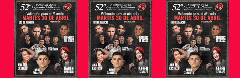La Fundación Festival de la Leyenda Vallenata anuncia que el martes 30 de abril a partir de las 7:00 de la noche en el Parque de la Leyenda Vallenata ’Consuelo Araujonoguera’, se llevará a cabo el acto de premiación de los ganadores del 52° Festival de la Leyenda Vallenata ‘Vallenato para el mundo’, y seguidamente se dará inició al concierto con artistas de la nueva generación de la música vallenata.